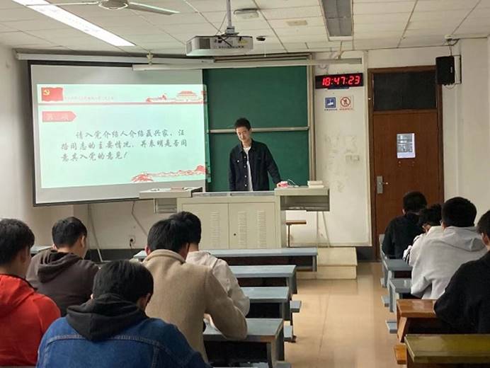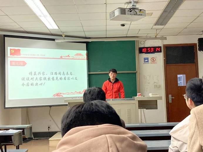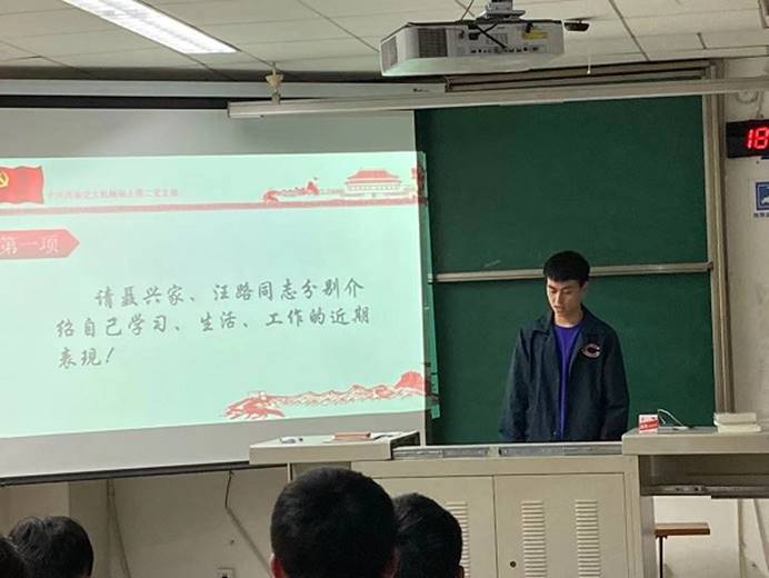 首先进行会议第一项议程,由聂兴家、汪路同志汇报对党的认识、入党动机、本人履历、家庭成员和主要社会关系情况、现实表现,以及需要向党组织说明的其他问题。聂兴家同志汇报说自己受亲人和同学中的党员同志影响,党员的先锋模范形象一直深入其心,故自己虽不是党员,却一直怀有一颗真诚入党的心,汪路同志生活中时刻帮助有困难的同学,学习上努力刻苦,积极向党组织靠拢。