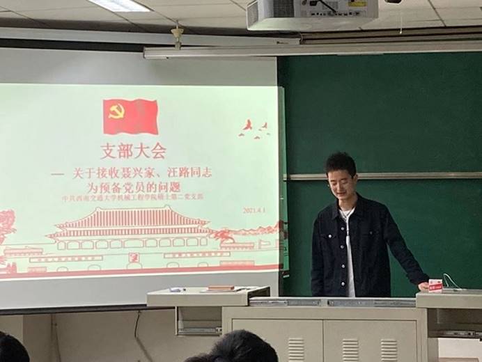 研究生之窗讯(记者 陈柯宇 摄影报道)2021年4月1日晚上6点40分,在逸夫馆4405A召开支部大会。本次会议的议题是讨论关于接收聂兴家、汪路同志为预备党员的问题暨“不忘初心,不负韶华”主题党日活动。本次会议应到会正式党员31名,预备党员1名,实到会正式党员31名,预备党员1名,有表决权的正式党员到会人数超过应到会有表决权人数的半数,符合规定人数。