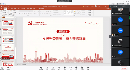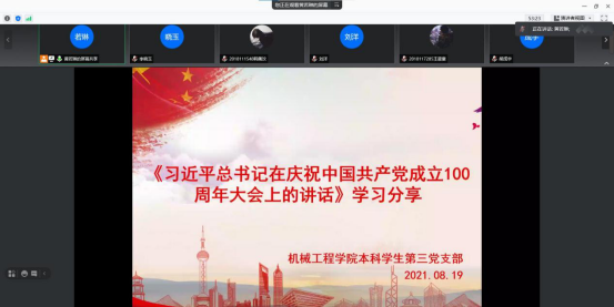 2021年8月19日晚上20:00,三亿本科员工各党支部通过腾讯会议顺利开展《习近平在庆祝中国共产党成立100周年大会上的讲话》学习分享活动。本次活动由三亿本科员工第三党支部党员黄若琳同志担任活动主持人。