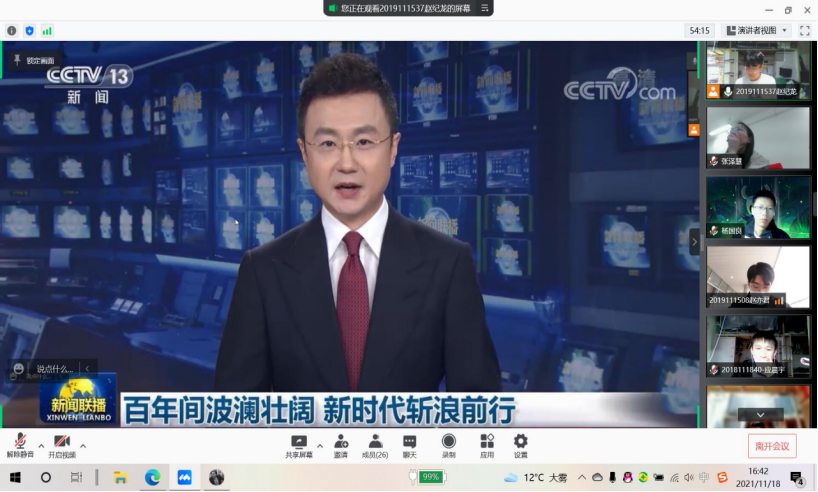 第二个部分为介绍党的十九届六中全会公报内容,此部分借助11月11日新闻联播《中国共产党第十九届中央委员会第六次全体会议公报》来为大家讲解,共同学习。全会听取和讨论了习近平受中央政治局委托作的工作报告,审议通过了《中共中央关于党的百年奋斗重大成就和历史经验的决议》,审议通过了《关于召开党的第二十次全国代表大会的决议》。习近平就《中共中央关于党的百年奋斗重大成就和历史经验的决议(讨论稿)》向全会作了说明。视频学习期间同学们注意力专注,对学习党的十九届六中全会内容保持认真态度。