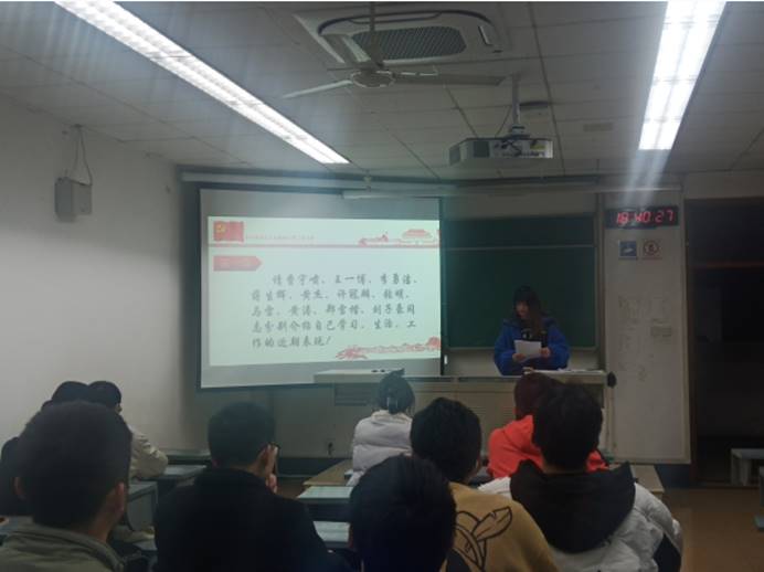 首先进行会议第一项议程,由曹宇啸、王一博、李勇洁、蒋生辉等同志一一汇报对党的认识、入党动机、本人履历、家庭成员和主要社会关系情况、现实表现,以及需要向党组织说明的其他问题。其中曹宇啸同志汇报说自己受亲人和同学中的党员同志影响,党员的先锋模范现象一直深入其心,故自己虽不是党员,却一直怀有一颗真诚入党的心;李勇洁同志生活中时刻帮助有困难的同学;黄杰同志学习上努力刻苦,积极向党组织靠拢;黄涛同志身为班级团支部书记,对班级事务认真负责,获得同学一致认可,希望加入敬爱的党组织,为党和国家的建设,贡献自己的力量。