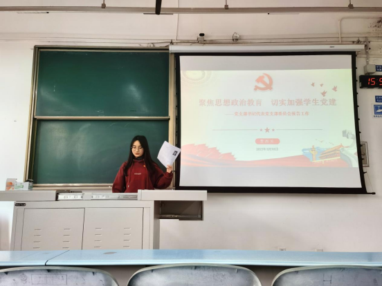 会上,党支部书记贾西贝同志代表党支部委员会作了工作报告,通报了党支部委员会查摆问题情况。贾西贝同志从教育党员、管理党员、监督党员、组织师生、服务师生、宣传师生及围绕中心大局等方面详细介绍了支部近一年来的工作情况。支部年度发展、毕业共计64名党员,联系团支部23个,现有党员40人,其中正式党员8人。贾西贝同志表示:“2021年,支部坚持履行好教育、管理、监督党员的基本职责,扎实开展党史学习主题教育,共组织或参与33次学习和会议,发挥凝聚、组织、宣传、服务师生作用,立足学习本业,力争建设为机械公司员工党支部的‘排头兵’”。