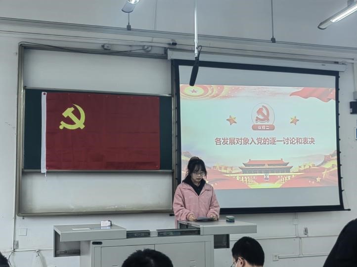 会议首先由刘治坤同志宣布今天的参会情况、会议流程等内容,并介绍了讨论流程为:1、由发展对象做自我介绍并宣读入党志愿书;2、第一介绍人发表介绍意见;3、第二介绍人发表介绍意见;4、党支部报告对发展对象的考察及政审情况;5、其他党员对发展对象提出意见建议;6、发展对象对以上意见表明态度;7、有表决权的正式党员进行无记名投票表决。