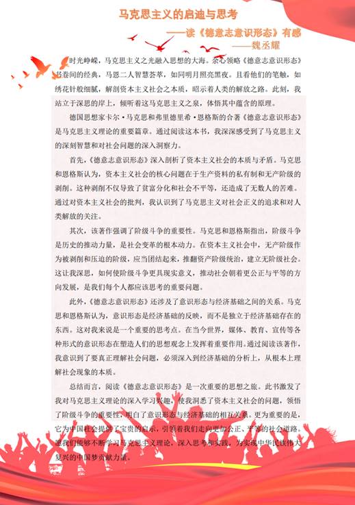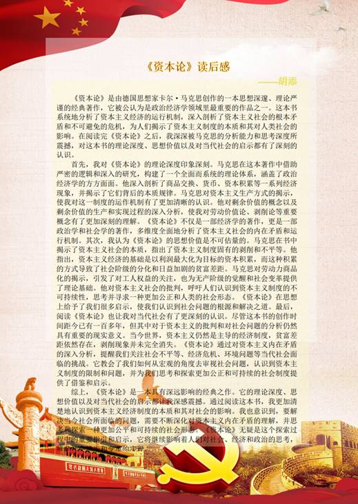 在活动中,魏丞耀同志通过阅读《德意志意识形态》,激发了他对马克思主义理论的深入学习兴趣,使他洞悉了资本主义社会的问题,领悟了阶级斗争的重要性,明白了意识形态与经济基础的相互关系。更为重要的是,它为中国社会提供了宝贵的启示,引领着我们走向更加公正、平等的社会道路。将不断学习马克思主义理论,深入思考和实践,为实现中华民族伟大复兴的中国梦贡献力量。胡添同志通过阅读《资本论》,意识到要解决当今社会所面临的问题,需要不断深化对资本主义内在矛盾的理解,并思考和探索一种更加公平和可持续的社会形态。