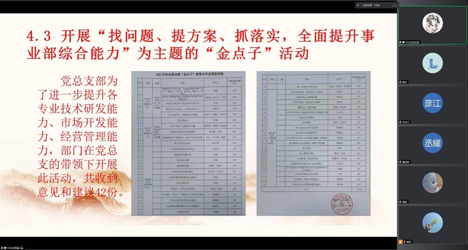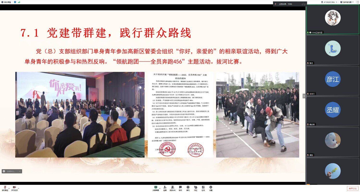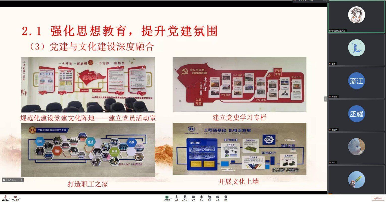 九洲电气工程与机电事业部党总支部宣传委员兼第二党支部书记卜柳茹书记分享了他支部的特色活动和一些宝贵的党建经验。(1)强化思想教育,提升党建氛围。将党建与文化建设深度融合,建立党员活动室,建立党史学习专栏,打造职工之家,开展文化上墙以及室组文化建设的大比拼等。(2)党建带业务,全面提升组织凝聚力、战斗力。开展“能力大提升,机电在行动”专项活动,开启“产学研”合作和工程化研究的新篇章,开展“找问题、提方案、抓落实,全面提升事业部综合能力”为主题的“金点子”活动等。(3)党建带群建、党建带团建、党建带妇建。党建带群建,践行群众路线;党建带团建,吹响冲锋号;党建带妇建,撑起半边天。