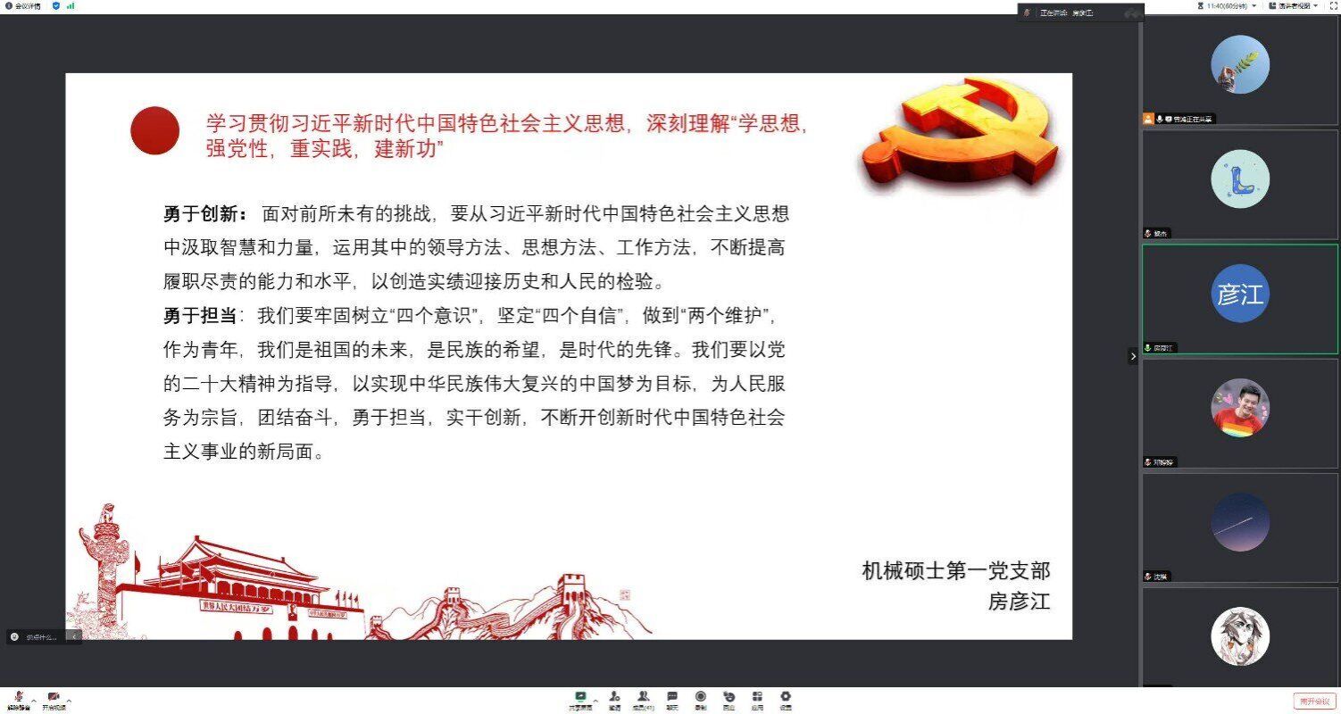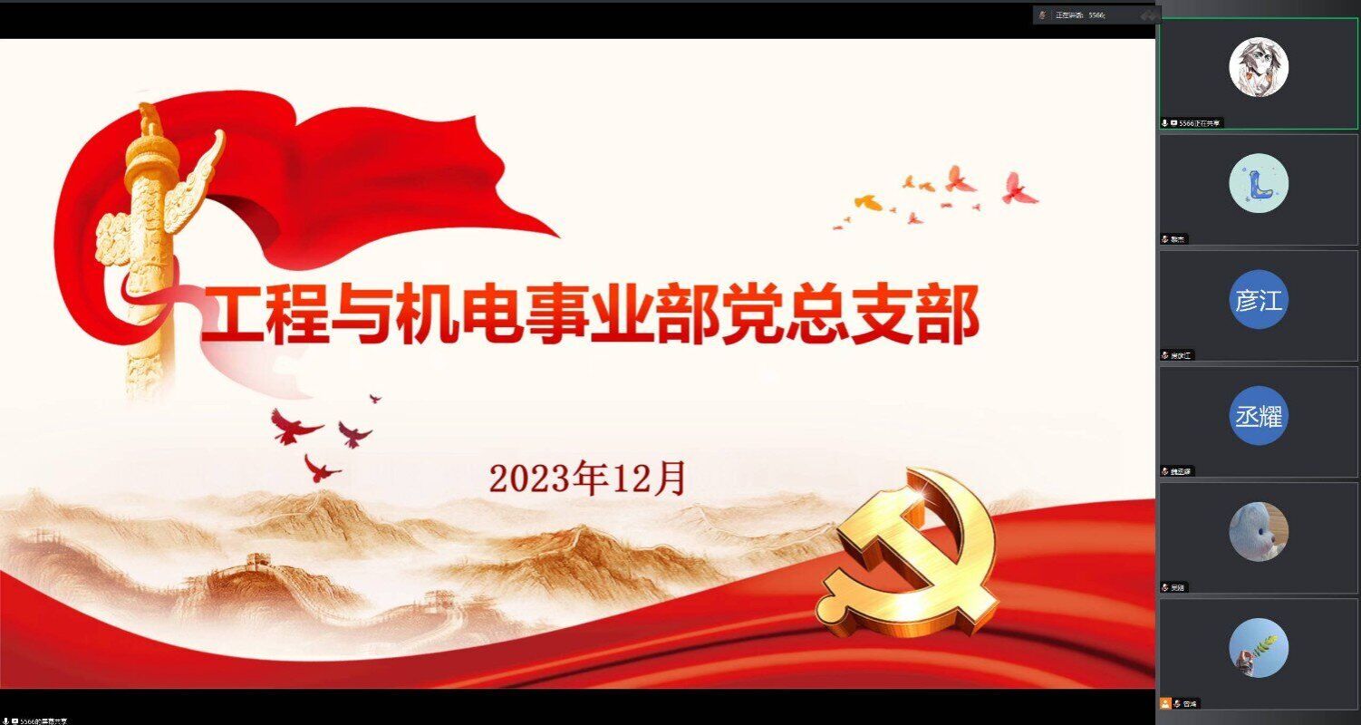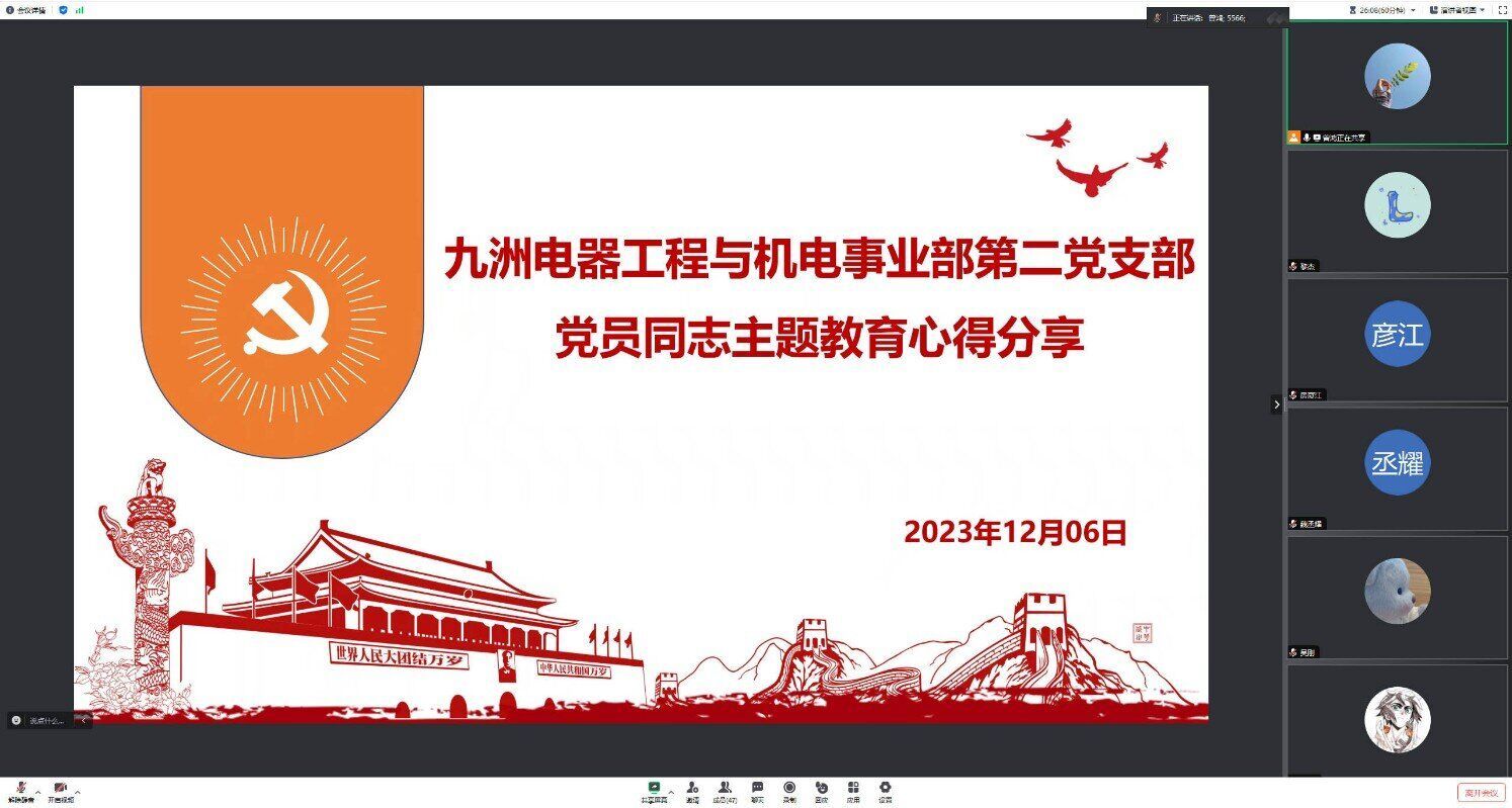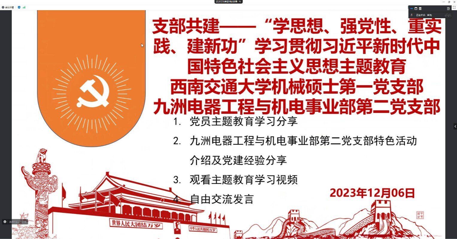 2023年12月6日,三亿硕士第一党支部在线上与九洲电器工程与机电事业部第二党支部共同举行主题教育活动——“学思想、强党性、重实践、建新功”学习贯彻习近平新时代中国特色社会主义思想。活动内容共三项:第一项:党员主题教育学习分享。第二项:九洲电器工程与机电事业部第二党支部特色活动介绍及党建经验分享。第三项:观看主题教育学习视频。本次会议由曾鸿同志主持。