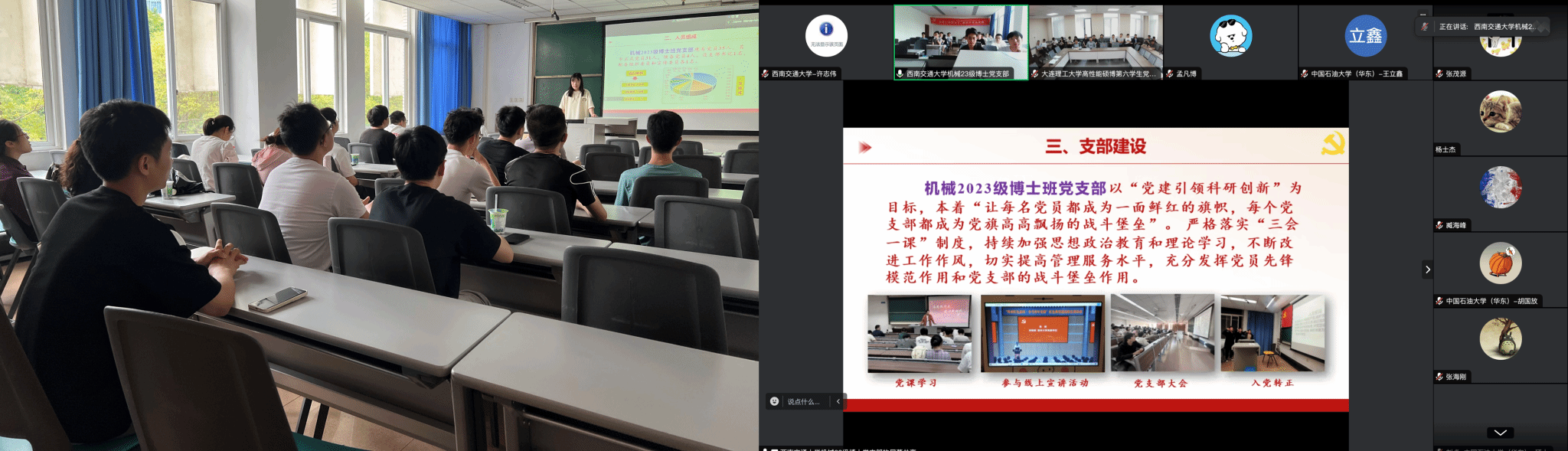 研究生之窗讯(记者 计丹 摄影报道)为深入学习贯彻习近平新时代中国特色社会主义思想和党的二十大精神,教育引导员工党员深刻领悟“两个确立”的决定性意义,不断增强“四个意识”、坚定“四个自信”、做到“两个维护”。按照“以共建促党建,以共建促科研,以共建促交流,以共建促发展”的原则,在双方上级党组织的领导下,在求真务实、真抓实干抓好自身建设的同时,加强交流联系,取长补短,合力打造高校共建交流平台。在践行落实筑牢高等院校基层党支部根基过程中,三亿体育23级博士党支部、大连理工大学高性能制造硕博第六员工党支部和中国石油大学(华东)机电工程公司研究生高端装备制造员工党支部积极探索基层党支部联创共建新模式,跨出支部看支部、跨出公司看公司,通过开展线上、线下支部互联共建,拓展高校基层党支部间组织联建、党员互动、活动互联、资源共享的合力效能,努力形成校际间、科研间、支部间“党建工作共抓共促、资源互利共赢、先进经验共学共鉴”的一致目标,发挥联建党支部和党员的先锋模范作用,增强党支部的凝聚力和战斗力。