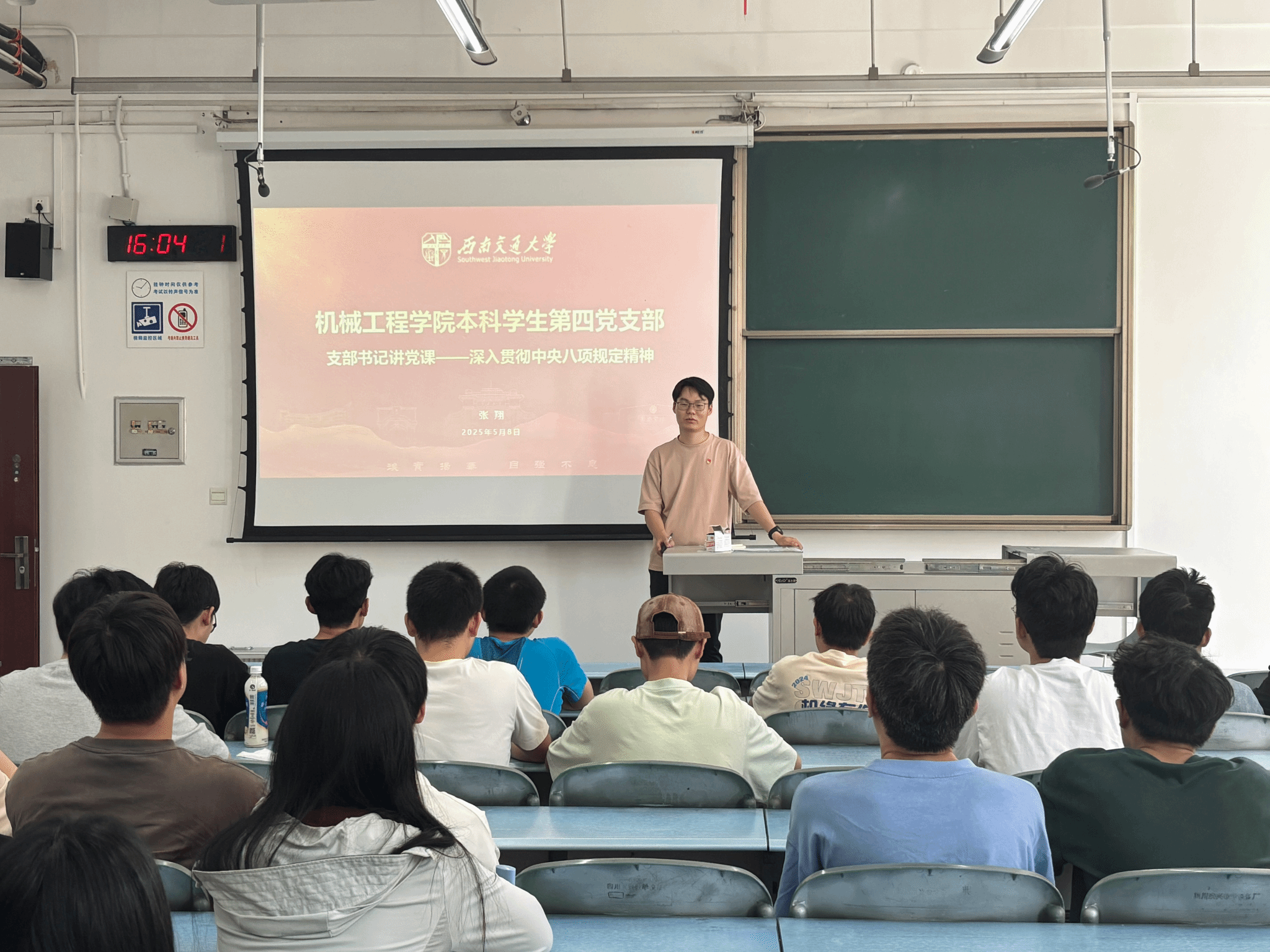 为深入学习贯彻习近平总书记关于加强党的作风建设的重要论述,扎实开展深入贯彻中央八项规定精神学习教育,推进作风建设常态化长效化,5月8日,本科员工第四党支部开展支部书记讲党课主题党日活动,支部书记张翔老师以“深入贯彻中央八项规定精神”为主题,为支部全体党员讲授了一堂作风建设党课。