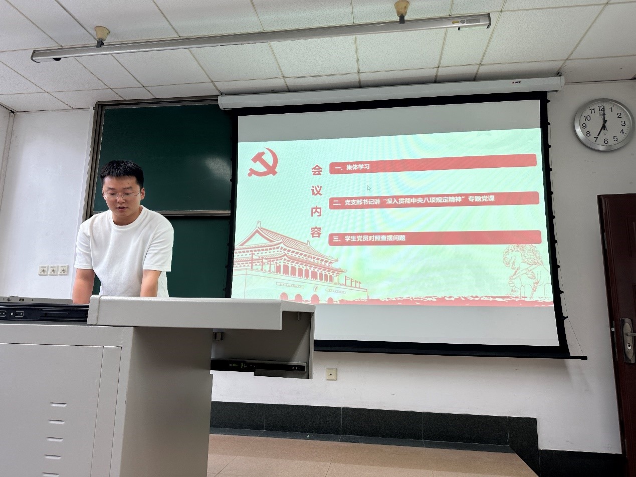 研究生之窗讯(记者 房彦江 摄影报道)2025年5月15日,三亿硕士第一党支部在九里校区4号教学楼J4222召开党支部大会。学习内容共三项:集体学习、党支部书记讲“深入贯彻中央八项规定精神”专题党课、员工党员对照查摆问题。本次会议由杨明宇同志主持。