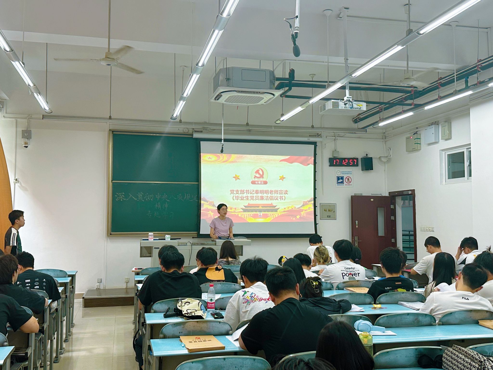 其次,党支部书记奉明明宣读《崇德尚廉 笃行致远 ——2025 届毕业生党员廉洁倡议书》,号召全体毕业生党员加强理论学习,以党的创新理论武装头脑,锤炼忠诚干净担当的政治品格;牢记党员身份,在毕业离校与未来工作中发挥模范作用,文明离校、建功立业。