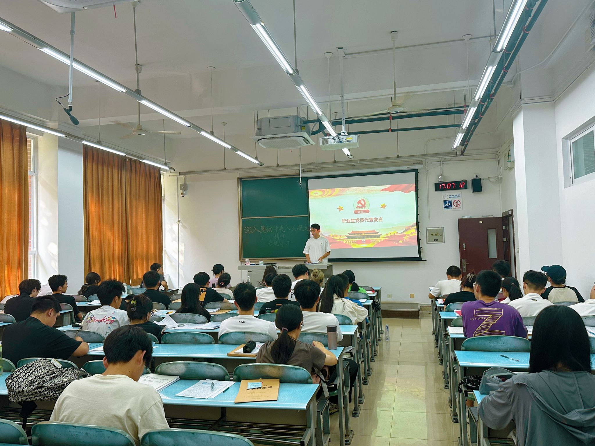随后,毕业生党员代表吴骏秋在发言中回顾 “从普通员工到党员骨干” 的成长历程,以帮扶同学、参与志愿服务等事例诠释党员先锋模范作用,并代表全体毕业生党员表态:“将牢记听党话、跟党走的政治立场,把廉洁作为青春底色,在平凡岗位践行奉献精神。”
