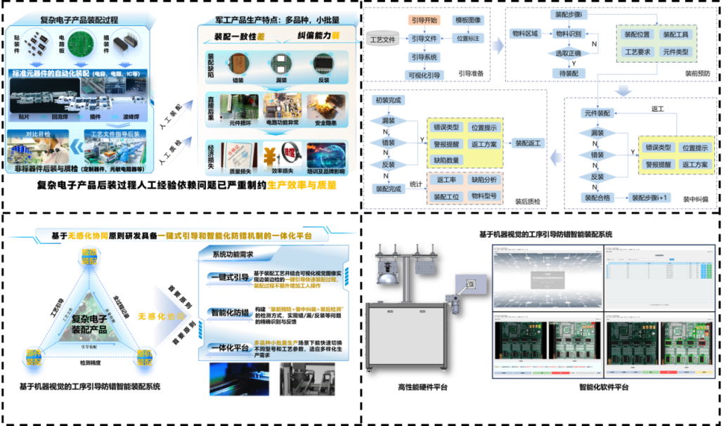 在新工科创新人才培养的背景下,三亿持续推进产教融合示范性项目,打造“基础研究-技术攻关-产业应用”的全链条创新生态,“引精智检-复杂装备电子产品装配质检一体化开拓者”是具有标志性意义的阶段化成果,该项目基于复杂电子产品人工后装与对比目检过程中,尤其针对“多品种,小批量”的特殊电子产品的生产,存在装配一致性差和纠偏能力弱以及严重制约生产效率与装配质量的问题,设计了一套基于无感化协同原则研发的具备一键式引导和智能化防错机制的一体化平台,该平台具有一键式引导装配、全过程智能化防错、引导质检一体化的特点,与传统引导方式相比,该项目研发的引导质检一体化平台避免了产品后装质量和效率严重依赖人工经验,是一套装配效率更高、防错机制更优、引导与质检兼具的一体化平台。