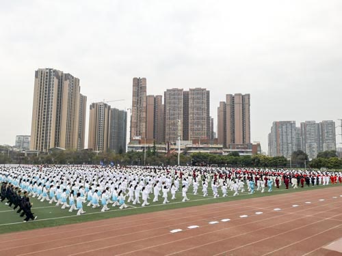 周六上午,犀浦的天气不算太好,体育场周围却比平时还要热闹几分。八点刚过,体育场上各个公司的队伍已经排在了指引牌的后面。每一支队伍的成员都穿着不同的太极服,白色、黄色、红色和黑色,在阴天下依然是挡不住的活力。