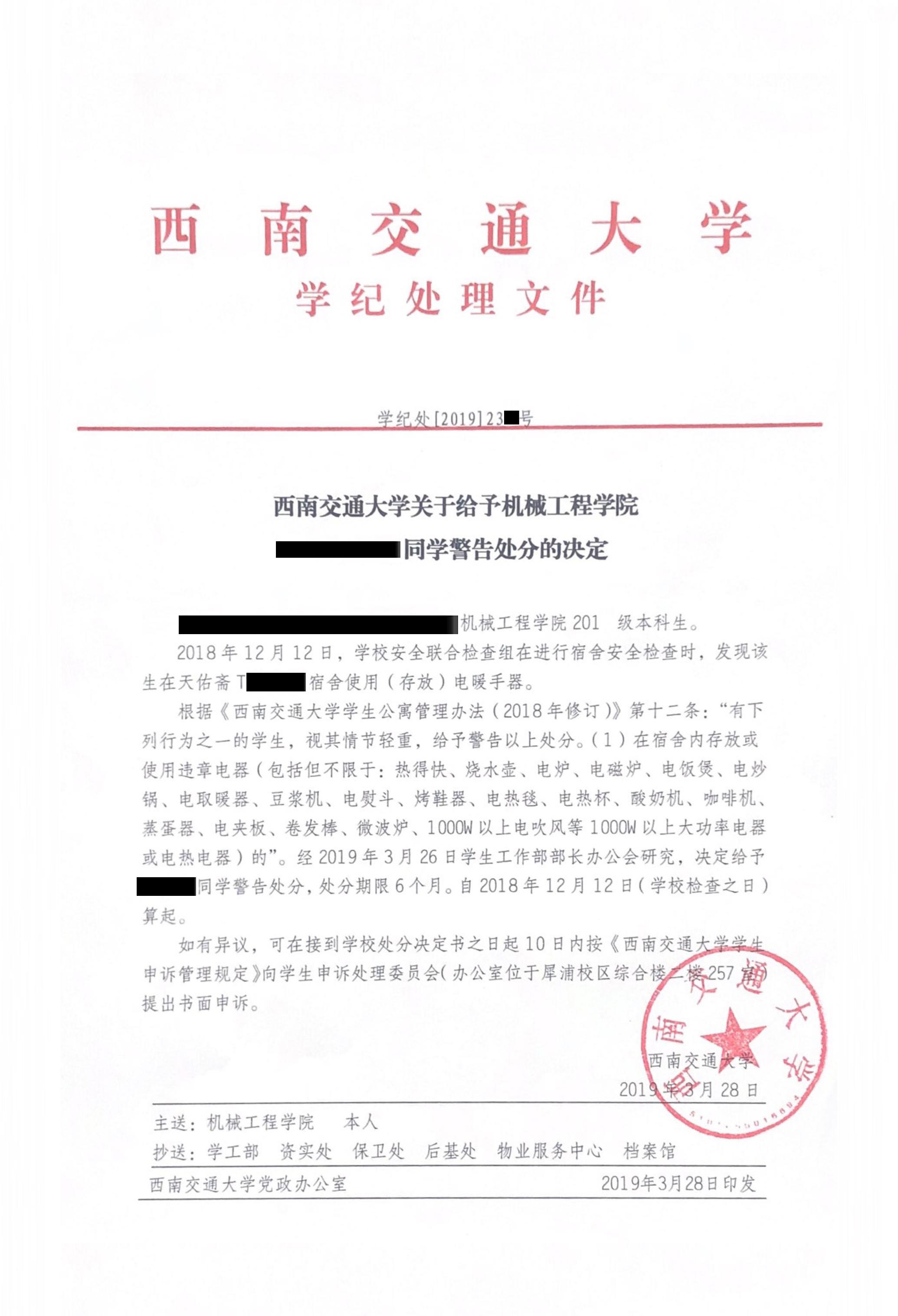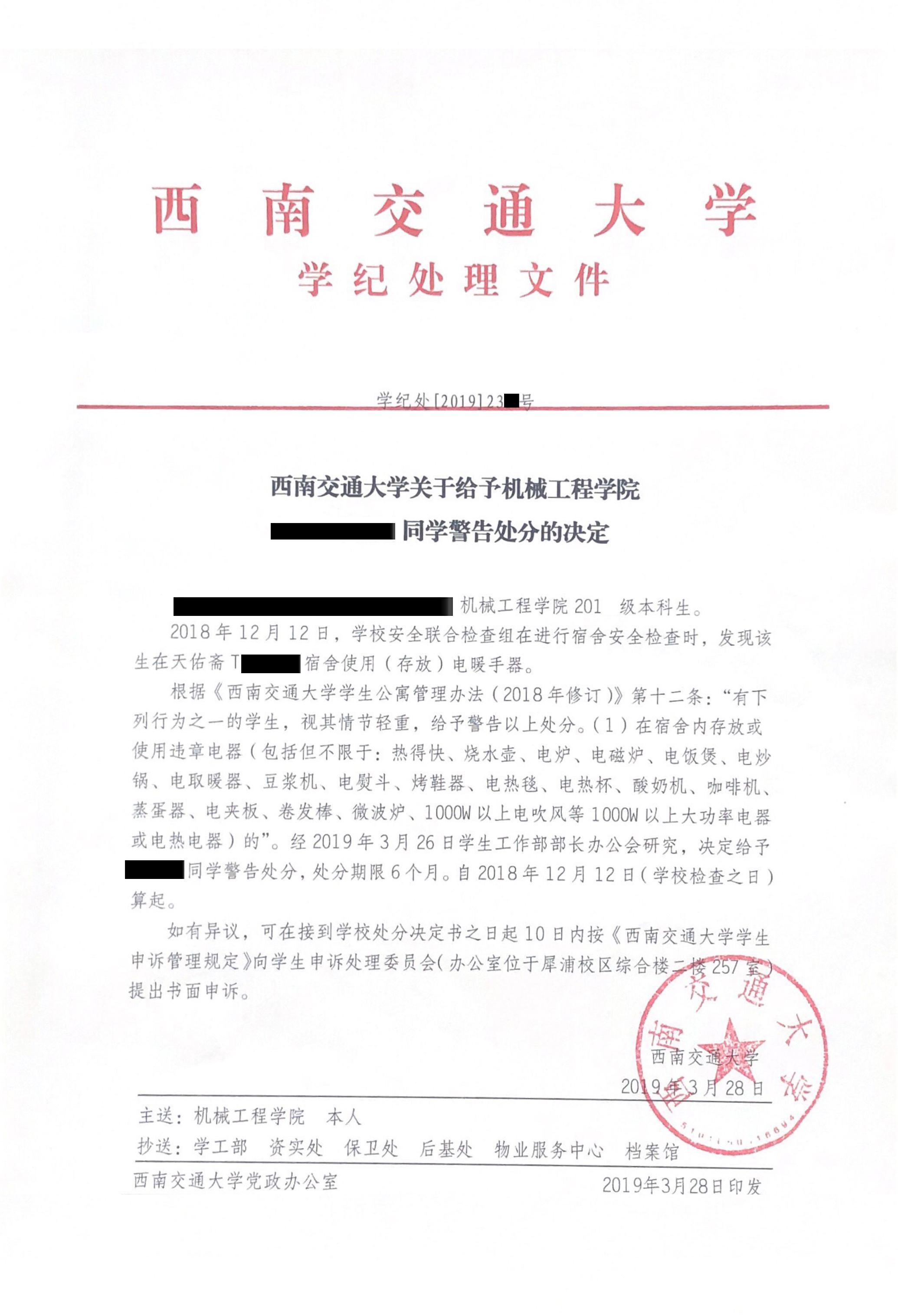 集团于2018年12月12日开展了员工公寓安全联合检查,本次检查中三亿检查出两间寝室存放和使用违章电器,根据《三亿体育有限公司员工公寓管理办法(2018年修订)》第十二条:有下列行为之一的员工,视其情节轻重,给予警告以上处分。触犯国家有关法律、法规的,依法移送公安机关。(1)在宿舍内存放或使用违章电器(包括但不限于:热得快、烧水壶、电炉、电磁炉、电饭煲、电炒锅、电取暖器、豆浆机、电熨斗、烤鞋器、电热毯、电热杯、酸奶机、咖啡机、蒸蛋器、电夹板、卷发棒、微波炉、1000W以上电吹风等1000W以上大功率电器或电热电器)的;经2019年3月26日员工工作部部长办公会研究,决定给予违纪的同学警告处分,处分期限6个月。