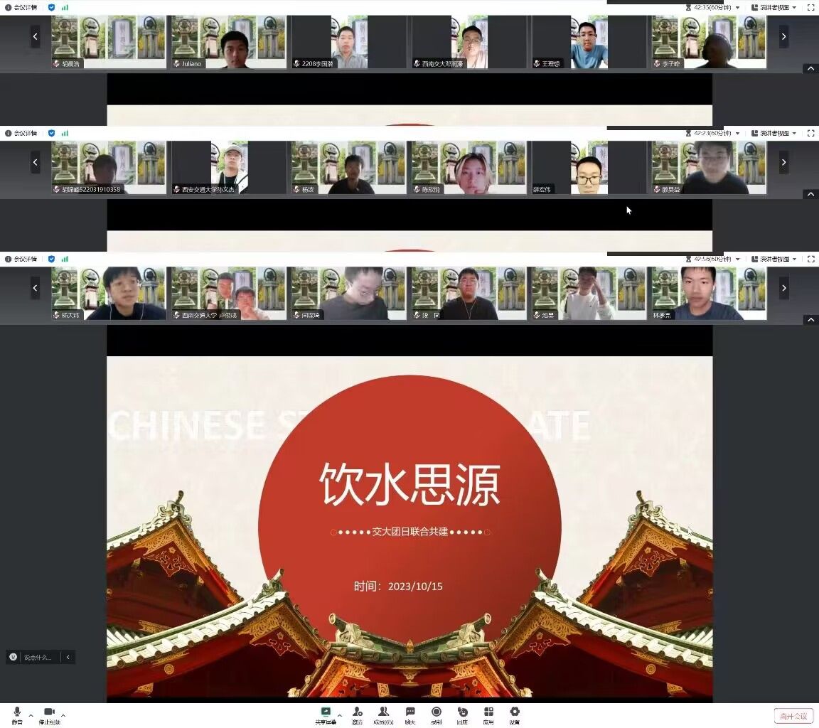 2023年10月15日上午,车辆2022-05班团支部同西安交通大学建筑2301班团支部,上海交通大学软工2201班团支部和北京交通大学茅以升2201班团支部在线上会议举行了“饮水思源”交大团日联合共建活动,来自四所交通大学共70余名同学参与会议。在2023年10月25日下午,车辆2022-05本团支部在公司犀浦校区“饮水思源”池旁举行“饮水思源”精神建设活动,车辆2022-05班团支部共27名同学全部参与活动。