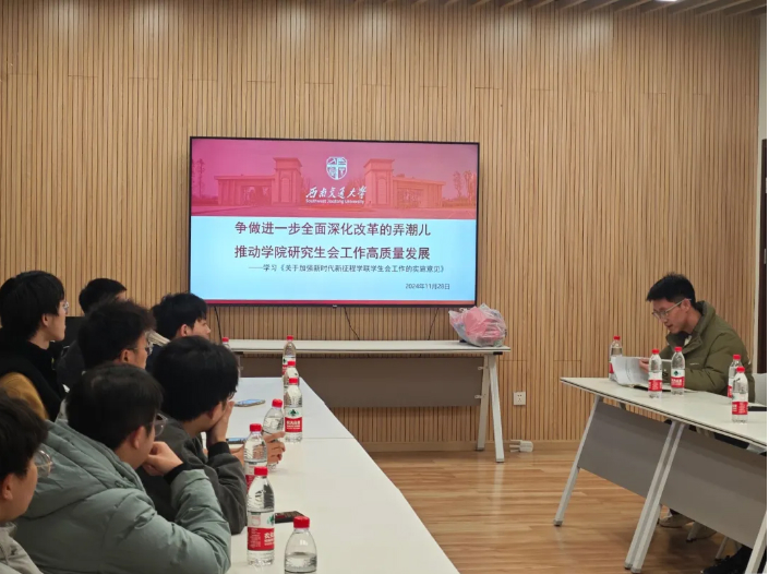 会议首先由领学人A岗主席喻富洪带领与会成员深入学习《关于加强新时代新征程学联员工会工作的实施意见》,结合研究生自身实际情况,进一步认识研究生会组织工作的政治性、先进性和群众性,鼓励大家主动将“小我”融入“大我”,在强国建设、民族复兴伟业中刻苦学习、挺硬担当。