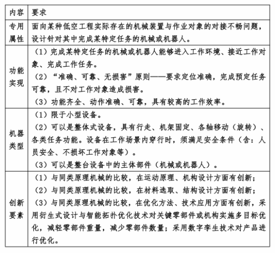 内容说明:通过调研,针对某类工程的特点自行提出设计需求,明确设计功能目标,完成发展低空经济情景下使用的机械或机器人设计。