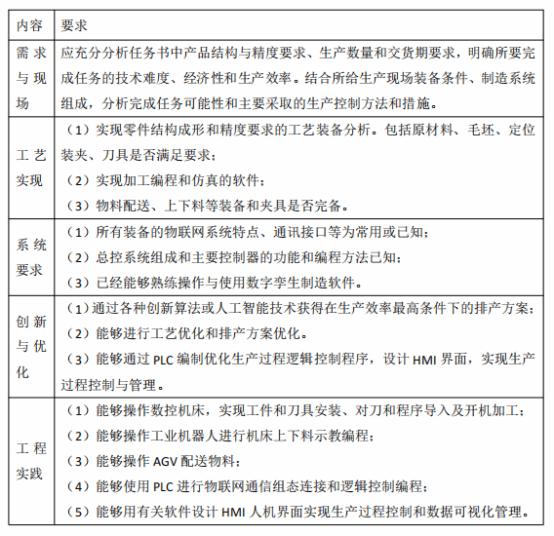 内容说明:通过需求分析,针对提供的智能制造工艺装备和系统组成,自行设计典型零件的制造工艺过程卡,并将过程卡中的数控加工部分编制工序卡,设计合理的工步内容和工艺参数,选择合适的刀具并编制刀具卡;通过CAM 软件编制数控加工程序,在数字孪生软件中完成数控加工仿真;进行资源调度和生产排产设计,获得优化的一个最短生产周期的排产计划,设计工艺流程图和生产流程控制逻辑框图;进行数字孪生机床加工仿真调试、机器人上下料示教编程调试、AGV 物料配送 PLC 编程调试,物联网通讯设置和系统总体联调。实现多品种小批量产品的混流智能制造。