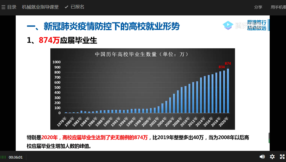 首先,孟书记对于新冠肺炎疫情之下高校毕业生就业形势进行了分析,孟书记指出,近年来我国高校毕业生逐渐增加,特别是今年,高校应届毕业生达到了史无前例的874万,比去年整整多了40万,再加之当下的疫情对各行业的冲击,一些单位的招聘需求也会有所下降,毕业生就业压力明显增加。