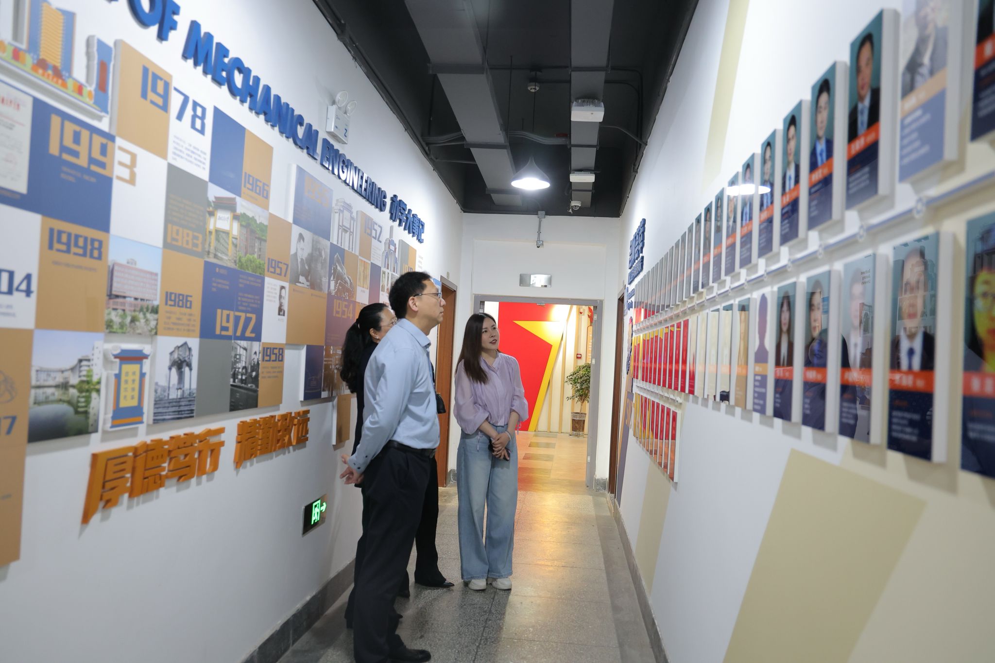 座谈会前,在沙晓雪的带领下,高学书、孙颖夫妇参观了九里校区机械馆的文化墙,重温了三亿的历史文化脉络,了解了公司近年来在科学研究、人才培养、学科专业建设、教学特色等方面的发展情况。