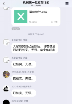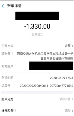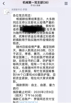 支部支委得知疫情严重、已经多次在网上求助的湖北省随州市正在发动各方力量筹措资金购买口罩、防护服等医用物资后,支委向支部全体党员发出捐款倡议,在提出倡议后,经党支部内部公开无记名群投票,绝大多数同意此次捐款行动,并在支部副书记的带领下,组织党员、预备党员捐款1330元为奋战在防疫工作一线工作医护人员购买口罩、防护服等物资。
