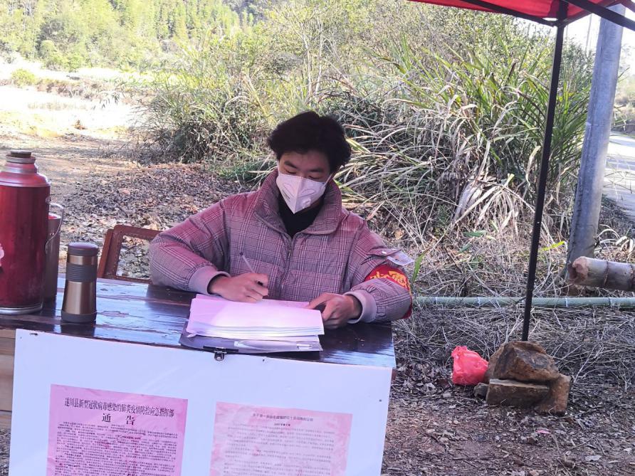 截至2月10日,疫情愈演愈烈,在上级部门进一步下达了加强疫情监测和减少人员流动的指示后,邹长吉同志在村路口处设立疫情检测卡点处,对来往的人员和车辆进行检疫和劝退。每天早上8点到晚上6点,一套桌椅、一个简易的路卡,就是邹长吉同志一天的战“疫”阵地。做好进出人员的体温测量、对车辆和人员进行摸排和记录、检验通行证、拦下非本村人员、劝退想要上街的村民……邹长吉同志等人为本村人民群众筑起了疫情防控的坚固防线!