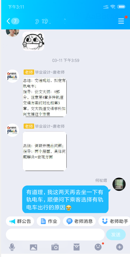 到目前为止毕业设计能做到这个进度,与毕设指导老师唐阳老师的悉心指导是分不开的。虽然受到疫情的影响,无法返回公司,但唐阳老师依然会在QQ群里每周一次地举行线上答疑会议,每周我们都会在群里通过电脑对毕业设计进度进行报告,而唐老师也会了解同学们的毕设进度情况,对每一位同学进行悉心地指导,及时地纠正同学们的毕设方向,给出建设性意见,避免同学们多走弯路。