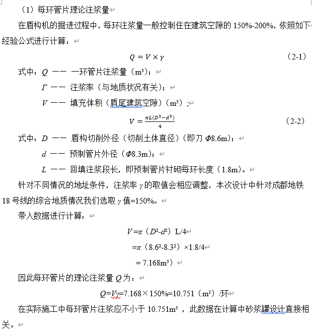根据工程概况确定了盾构机主参数,计算确定了同步注浆中每环管片的理论注浆量,理论单位注浆量与实际注浆量等参数(详见下页)。确定了包括浆液,砂浆罐,注浆管路,注浆泵在内的主要零部件。确定上述部件的工作要求。确定二次注浆方案,初步确定工作条件。