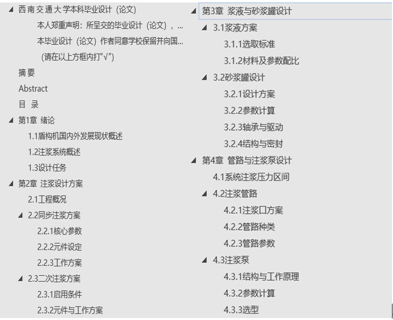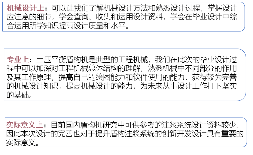 遗憾:在实际的设计过程中由于完整注浆系统设计可参考资料较少,因此即使在设计过程参考了一些实际工程盾构的注浆情况,在具体的设计思路方面也存在不少疑问,经与导师、学长等沟通后,确定采用逆向经验设计的方案进行完善。一些数据上的计算由于缺乏校核的方式也仅仅停留在理论层面,存在遗憾。