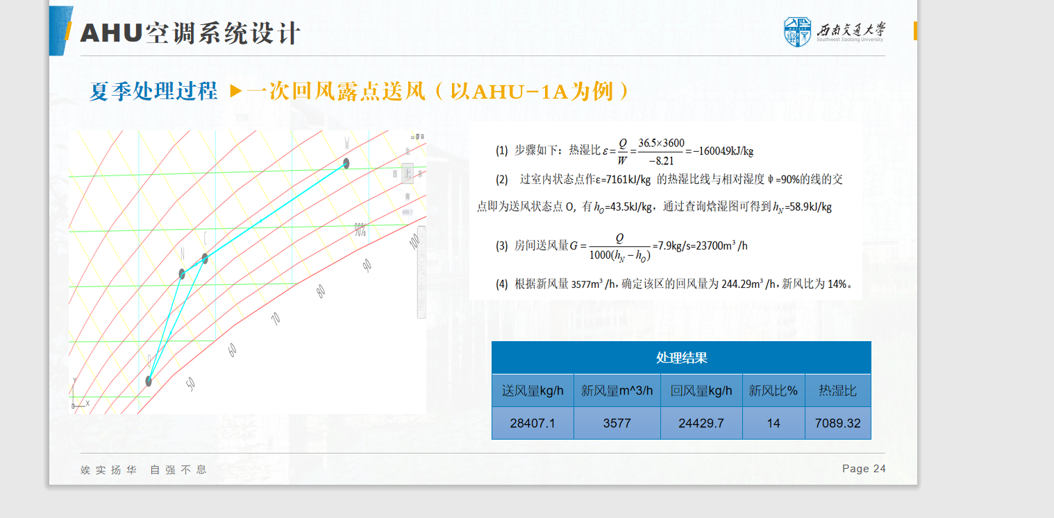 (4)空调过程计算:对夏季工况空调过程进行计算,得到相应的风量、新风量、送风参数等。