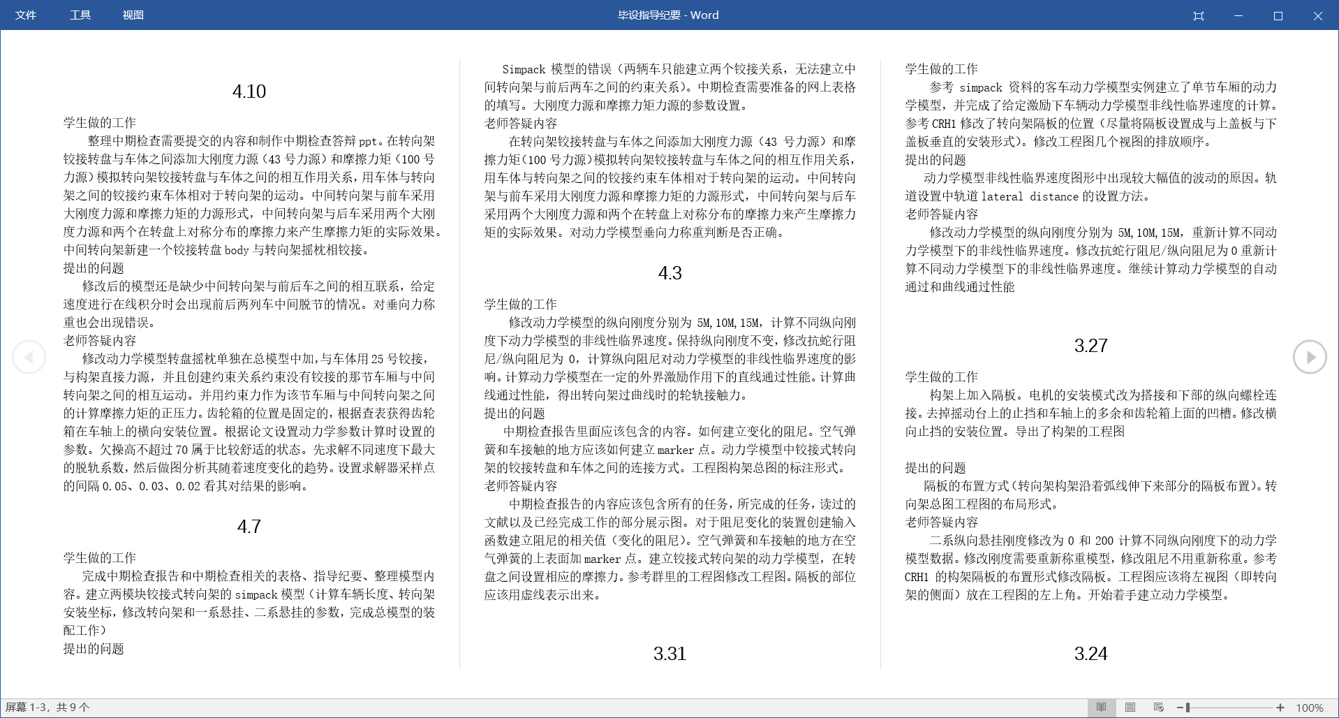 另外,也有一些关于毕设的干货分享给大家:①论文学习,每看一篇就提炼几句话出来整理到word中,这样十几篇论文看下来,所有比较重要的东西就集中在两三页文档里了,以后参考起来就会更加高效。②阅读外文文献,开始几篇整段整段百度翻译,注意看一句翻译就回过头看该句的英文,几篇之后就会对一些学术名词比较熟悉,接着不用翻译也能够看懂。③软件学习,直接从实例开始学习,跟着做成功一些实例就会对软件的了解大大提升,在很短的时间内就能够了解软件的主要操作。④三维模型的设计,对于很多需要自己设计形状尺寸和装配尺寸的模型,一边在电脑上画,一边在本子上画草图标注尺寸。这样在后续涉及到与之相关联的尺寸时就不用来来回回在电脑上打开文件。建立动力学模型也是一样,记录好相关参数,后面的检查和修改工作就能事半功倍。