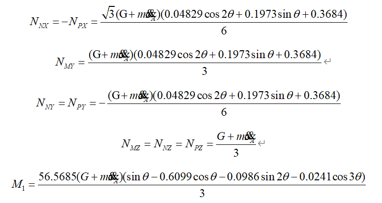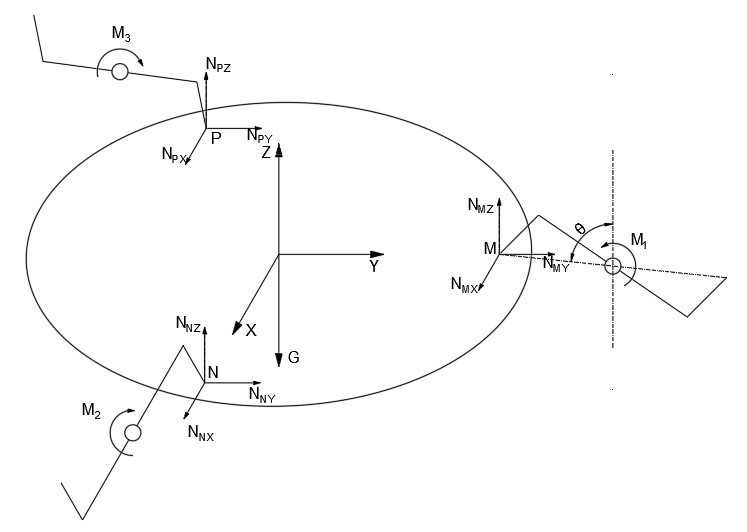 (4)攀爬机构的力学分析,如图8所示,绝缘子对攀爬机构的支反力属于空间力系问题,故为每个接触受力点建立对应的空间直角坐标系。由于检测机器人的运动具有周期性,并且攀爬爪是交替接触在绝缘子表面上的,在旋转角度区间为45°135°时,攀爬爪一端始终接触在绝缘子表面,在下个循环区间也是如此,故取旋转角度区间为45°