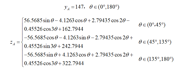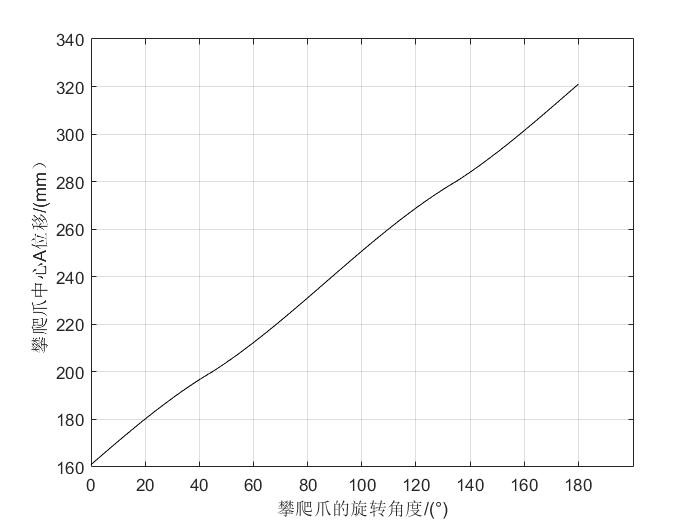(3)检测机器人的空间运动轨迹数学建模,对于该检测机器人的攀爬爪机构来说,属于机构的正运动学问题,即已知攀爬爪的旋转角度,求攀爬爪旋转中心的坐标。由于攀爬爪在工作时是上下两个爪交替进行的,攀爬爪的运动学规律改变在于攀爬爪和绝缘子表面是否有接触,故其运动学方程需要分段考虑。
