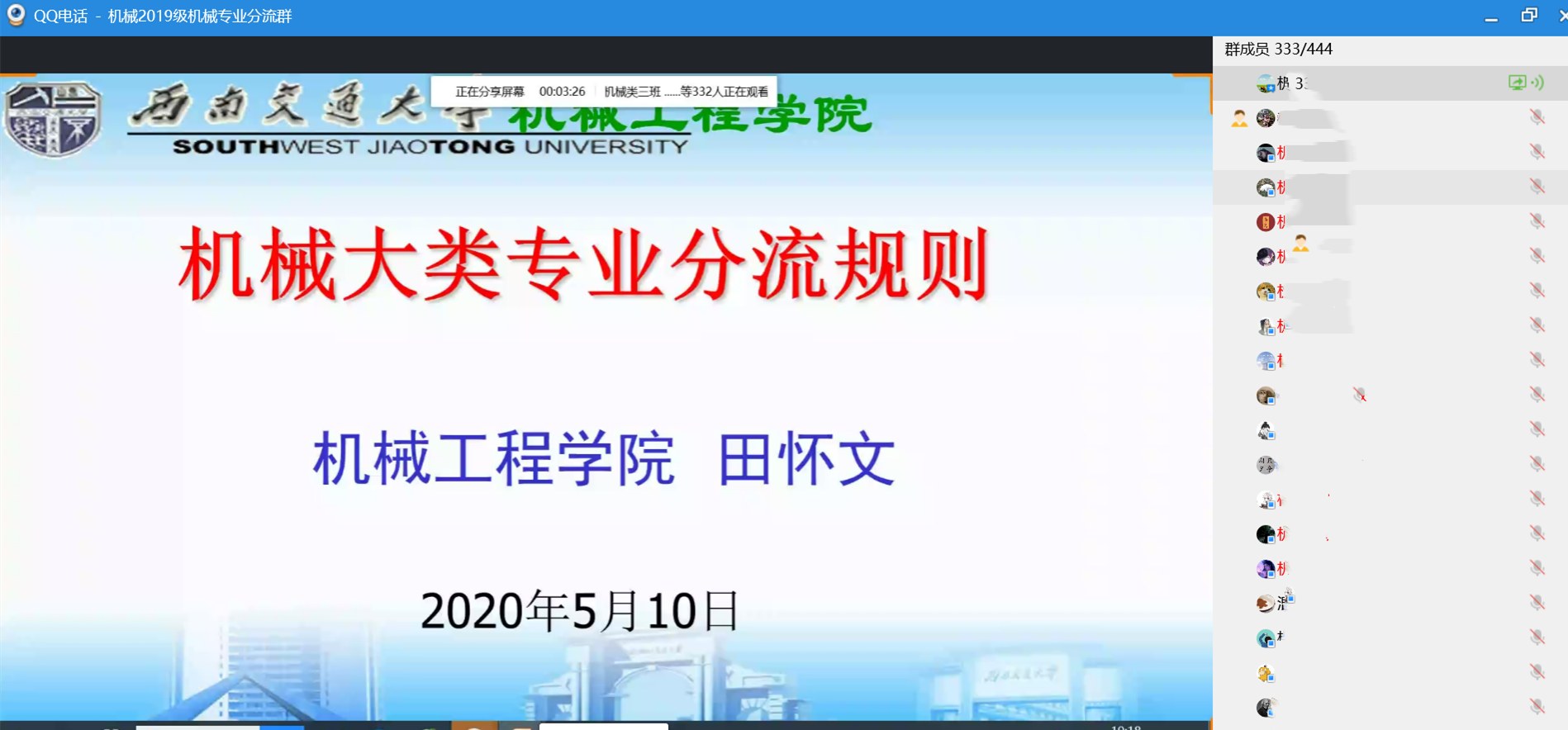 2020年5月10日19:00,三亿2019级机械类专业分流第二次线上交流会在2019级机械专业分流QQ群如期举行。本次交流会由公司李艳梅老师主持,邀请到公司副经理田怀文,副经理、建环系主任袁艳平,机电测控系副主任陈春俊,院教工委主任、工机系王少华、能动系郑东等5为教师为2019级机械类专业同学进行专业介绍。