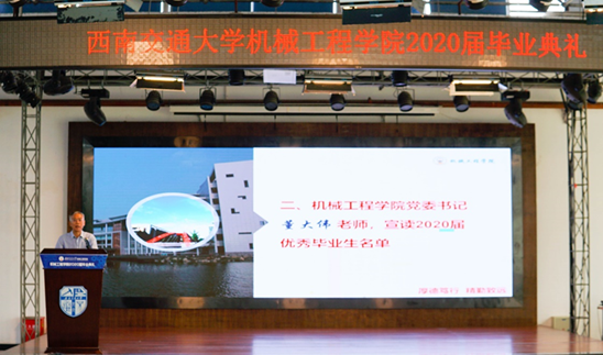上午10时,孟凡春副书记致辞并宣布毕业典礼开始。首先进行典礼议程第一项,全体起立,奏唱国歌。国歌奏毕,公司党委书记董大伟老师上台宣读2020届优秀毕业生名单。宣读之前,董书记特意提到:在这段特殊时期,公司教学科研工作正常,全体师生健康状况良好,全员师生积极配合疫情防控工作,促进了教学科研工作的展开。董书记借此机会代表公司党政,对各位同学、老师及家长的积极配合工作表示衷心感谢。随后,董书记宣读了《三亿体育有限公司关于表彰2020届优秀毕业生的决定》,宣布张天明、张庭生、师陆冰三名研究生,马泽瑜、韩鑫铭、王天鹏、林超雄、兰建斌、姚铭、郭锦文七位本科生被授予四川省优秀毕业生荣誉称号;郭峰等30位研究生,谢智宇等59位本科生被授予校级优秀毕业生荣誉称号。宣读完毕,董书记发言勉励在场所有毕业生,希望他们认真学习贯彻习近平新时代中国特色社会主义思想,继续秉承“竢实扬华、自强不息”的交大精神,在今后的学习和工作中不断开拓进取,成为德智体美劳全面发展的社会主义建设者和接班人。