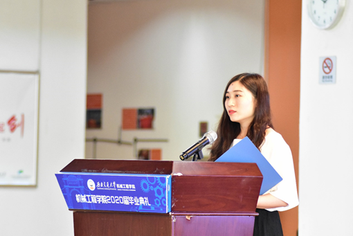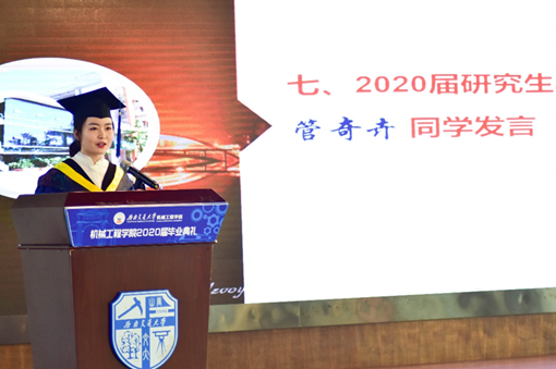 员工代表发言完毕之后,2020届毕业班辅导员代表蔡俊俊老师上台发言。在分别之际,蔡老师回顾了过往与同学们的点点滴滴,感慨同学们在四年中的成长之快,并用最亲切的语言叮嘱毕业生们在今后的生活中照顾好自己,也告诉同学们往后无论遇到什么困难挫折,辅导员们仍然在这里。