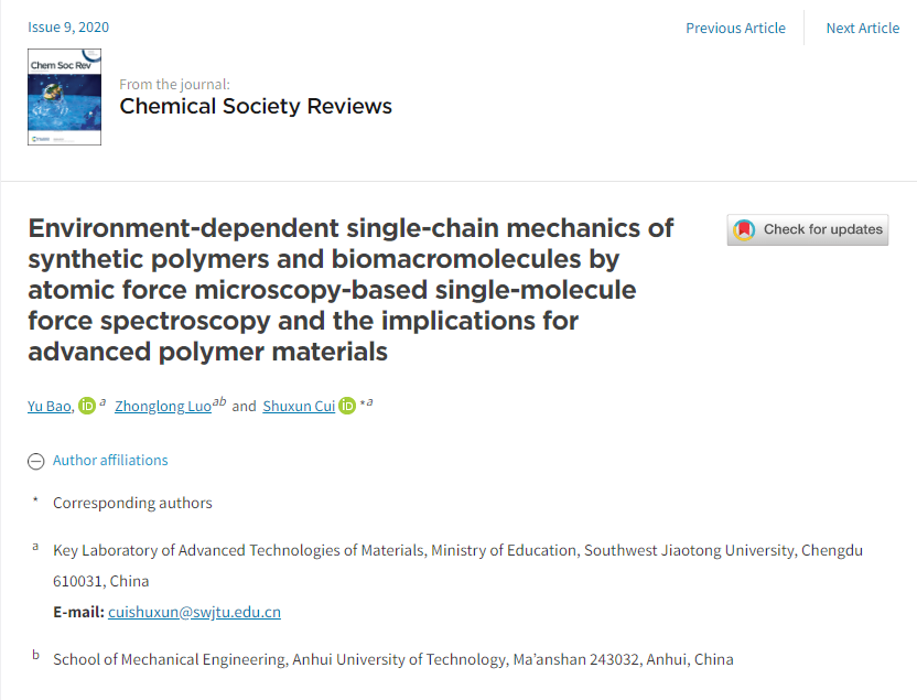 近日,公司崔树勋教授研究团队在化学一级学科顶级期刊Chemical Society Reviews(影响因子42.846)上发表论文“Environment-dependent single-chain mechanics of synthetic polymers and biomacromolecules by atomic force microscopy-based single-molecule force spectroscopy and the implications on advanced polymer materials”(2020, 49, 2799-2827),该论文第一作者为公司青年教师鲍雨博士,通讯作者为崔树勋教授。这是公司首次以第一单位在该著名期刊上发表论文。