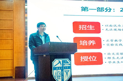 袁艳平就学位与研究生教育做出工作汇报。袁艳平表示2020年面临以面试为主的研究生复试无法照常进行,无法现场做招生宣传,信息传达不及时、不充分等实际困难,但在招生工作中公司坚持复试及复试过程中的各个考查项;采购防疫物资和复试设备、扩建试题库;组建疫情防控工作组、网络保障工作组,打造疫情之下的远程复试平台;采用考生双机位、复试双秘书制、流程三随机模式复试,共同打赢了疫情的攻坚战。