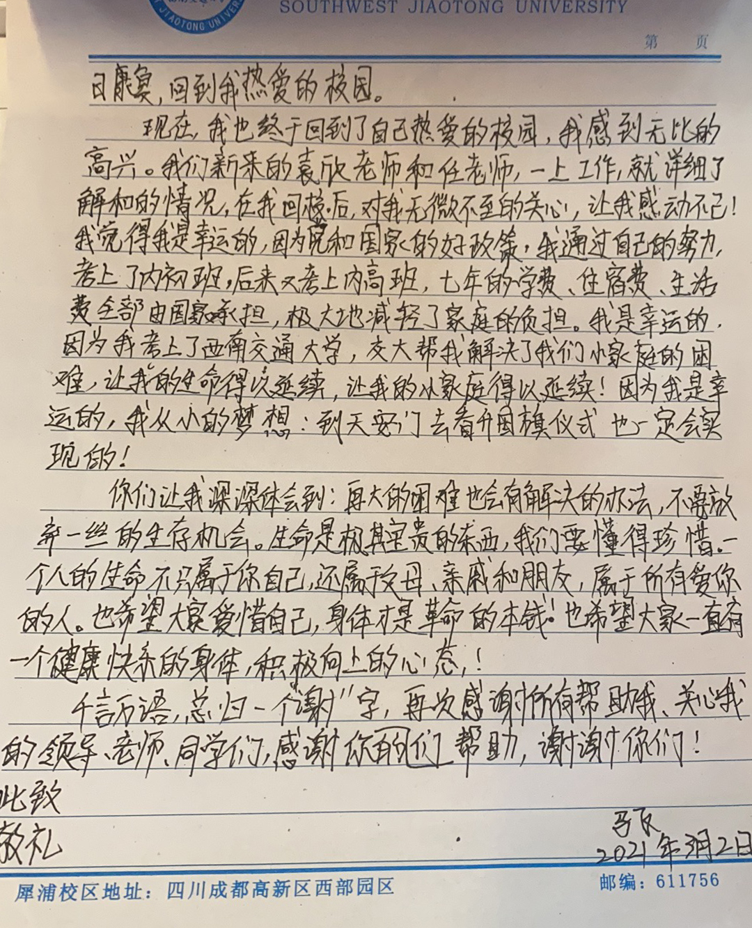 “我清晰记得,咱们三亿各级领导和老师都亲自来看望我,鼓励我,有孟凡春副书记,辅导员徐喆老师,胡豪老师,李曦老师,左弟晶老师,还有学工部宋副部长,还有新疆辅导员江晓军老师和伊力哈木老师,术前准备到术后,对我悉心照顾。”3月9日,一面锦旗和一封感谢信被送到了三亿体育员工工作组。