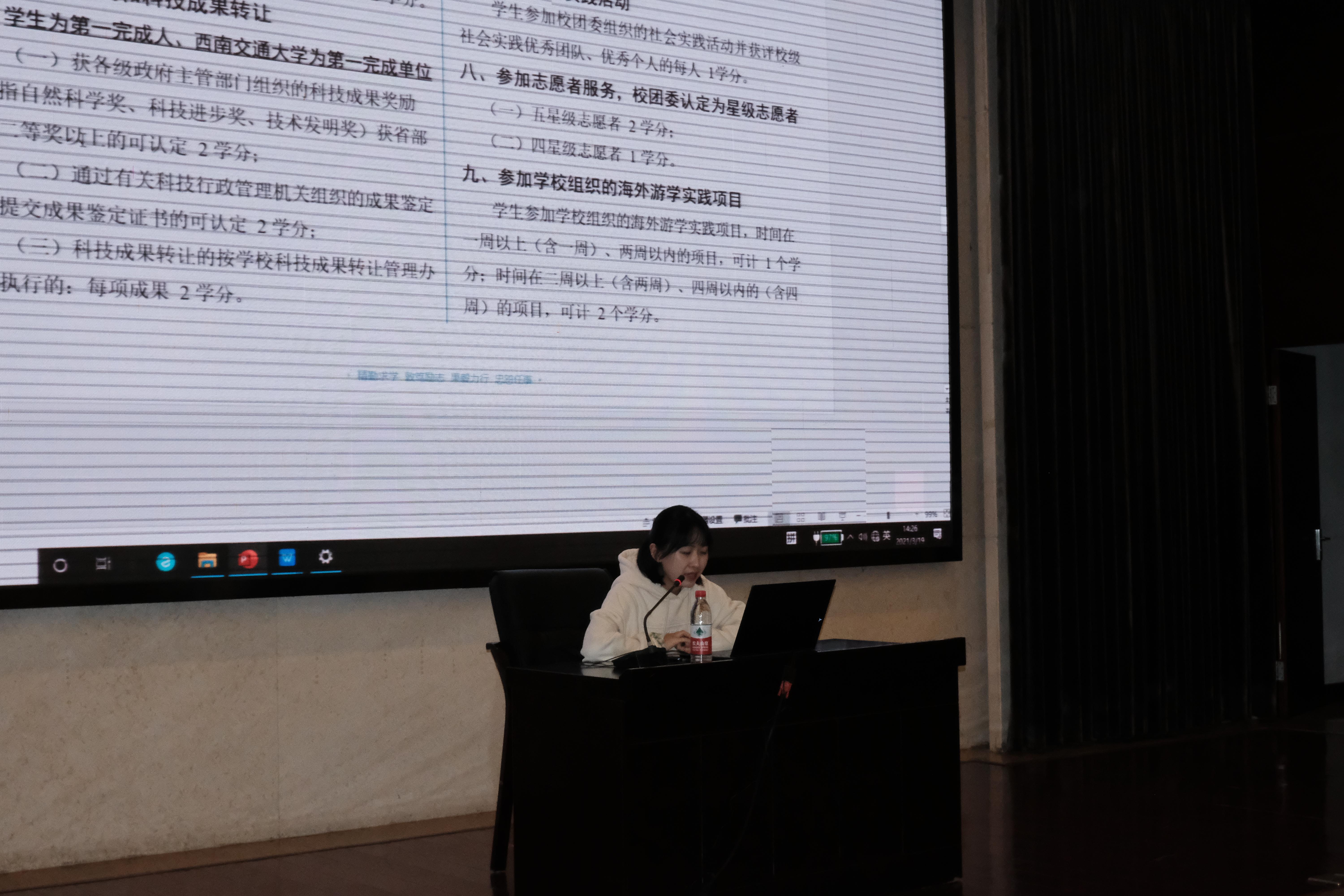 然后,罗晗葳老师从第二课堂建设以及创新学分认定两个方面作了专题讲座。罗老师首先从第二课堂的分类开始,详细地向在座师生介绍了第二课堂的学时要求以及学时预警等相关内容,并细致的介绍了第二课堂的选课流程,期间,罗老师着重针对选课过程中常见的问题为大家做出解答,解答内容包括了课程分类、成绩评定、选退换课、学时补救等诸多方面。