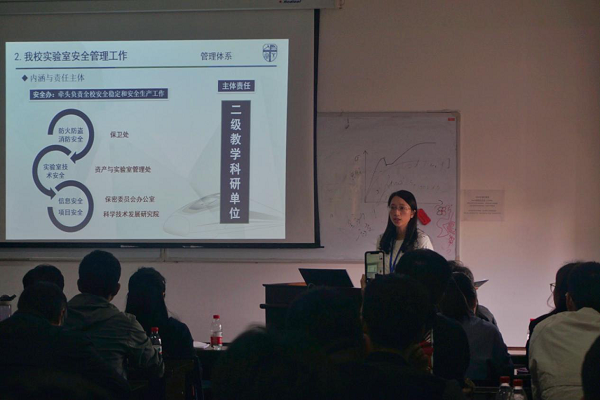 随后,资产与实验室管理处赵春花老师为师生介绍了公司实验室安全管理相关知识,首先是国家对实验室安全工作的要求和公司实验室安全管理工作,重点介绍了教育部检查指标、危险化学品及特种设备的管理,随后她还介绍了公司实验室安全教育宣传活动。她讲到公司实验室安全工作按照“统一领导、分级负责、责任到人”的模式,实行公司、二级教学科研单位、实验室的三级管理制度。赵老师还展示了公司与各二级教学科研单位签订实验室安全责任书、公司层面的规章制度以及我们身边的安全隐患等,最后她介绍了公司2021年度实验室安全教育宣传活动,倡导师生积极参加活动,提升实验室安全意识,共筑和谐平安校园。