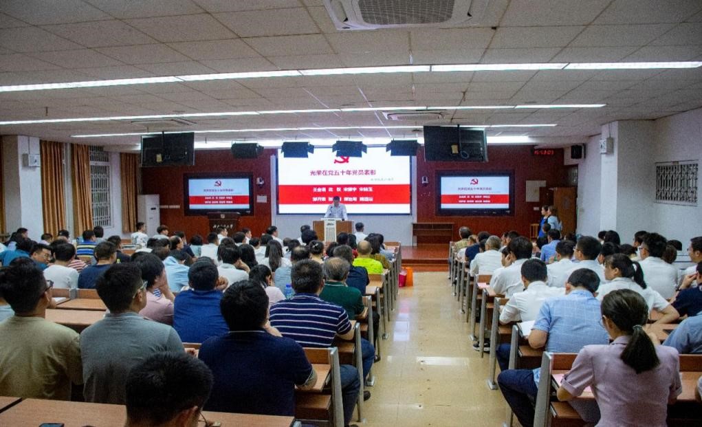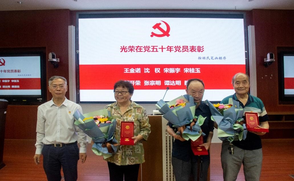 大会首先进行光荣在党50年纪念章颁发,公司王金诺、沈权、宋振宇、宋桂玉、邹开荣、张宗明、谭达明、魏道远等八位同志荣获光荣在党50年纪念章,董大伟为老党员代表颁发了纪念章,程军代表全院师生向老党员们表示致敬,感谢他们在革命和建设各个时期在不同岗位上为党的事业做出的重要贡献,祝福他们健康幸福!