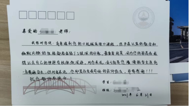 我想对您说:有幸选到您的机械原理课程,您严谨认真的教学和幽默风趣的性格都给我留下了很深的印象。最重要的是,因为您的推荐使我得以去自己理想公司继续深造。对您来说,我可能是您漫漫教员工涯的一名普通员工,但对我来说,您却是改变我命运的良师益友,非常感谢!!!祝您教师节快乐!