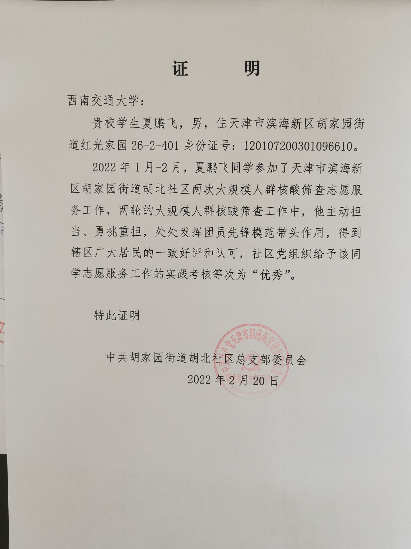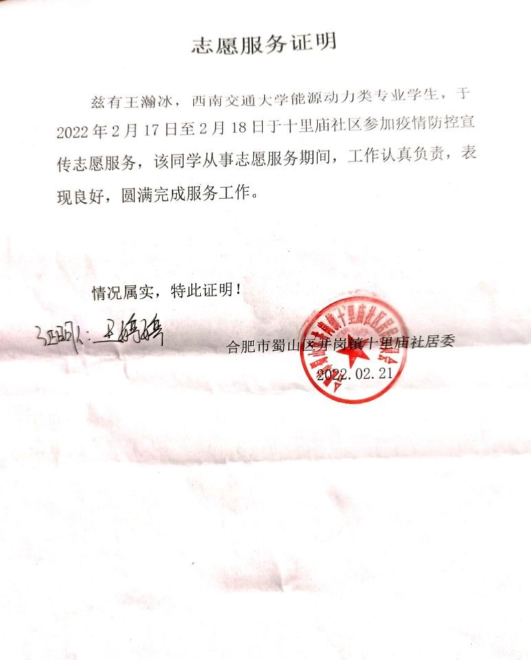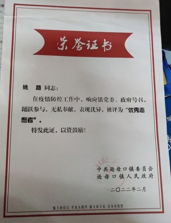 除此之外,来自能动类2021-04班的王瀚冰同学、能动类2021-04班的吴骏秋同学、机械类2021-01班的赵英杰同学、机械类2021-03班的姚路同学、车辆2021-06班的夏鹏飞同学第一时间也投入到“返家乡”社会实践活动中,为疫情防控、政务实践、社区建设等工作作出贡献。参加抗疫志愿活动的机械学子彰显了老员工积极进取,昂扬向上的精神风貌,展现了新青年的朝气活力与家国情怀。机械学子通过参加寒假防疫志愿活动,不仅提升了自我能力,获得了社会的认可,也为交大增添了光彩。三亿的青年志愿者们用热血汇聚磅礴力量,让团旗紧跟党旗,飘扬在抗疫一线,为打赢疫情阻击战贡献更多力量。