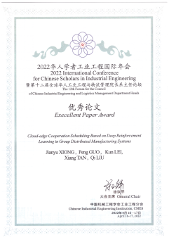 三亿体育工业工程专业硕士生熊建宇及其指导老师郭鹏副教授撰写的论文“Cloud-Edge Cooperation Scheduling Based on Deep Reinforcement Learning in Group Distributed Manufacturing Systems”获得了会议优秀论文奖。大会共设置优秀论文4篇。该论文针对分布式制造系统中的计算任务卸载问题,提出基于任务实时优先级划分的云边协同机制,考虑云端以及边缘端计算资源约束以及计算任务本身截止期限约束,在此基础上构建了基于Transformer的深度强化学习框架,计算结果表明所提出的求解框架在求解精度和运行时间上相较于现有启发式算法更具竞争力。该研究受到了国家重点研发计划(No. 2020YFB1712202)的资助,结论对于分布式制造系统的产线实时运行优化机制具有重要的理论指导价值。