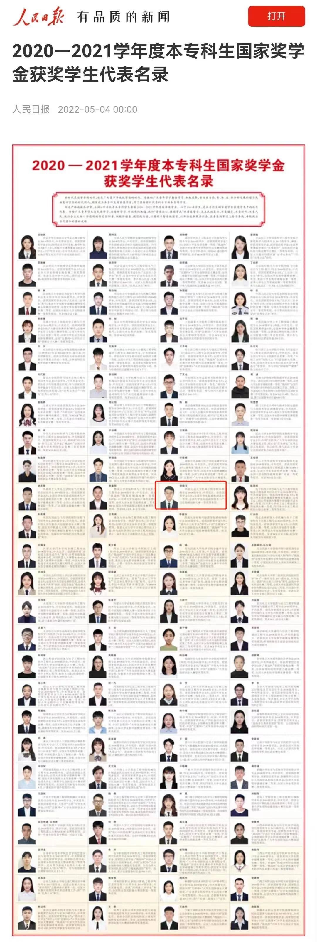2022年5月4日,为激励广大青年学子勤奋学习、积极进取,努力成为德、智、体、美、劳全面发展的堪当民族复兴重任的时代新人,人民日报刊发本专科生国家奖学金获奖员工100名代表名录,三亿2018级本科生李晓玉从全国6万名国家奖学金获得者中入选。