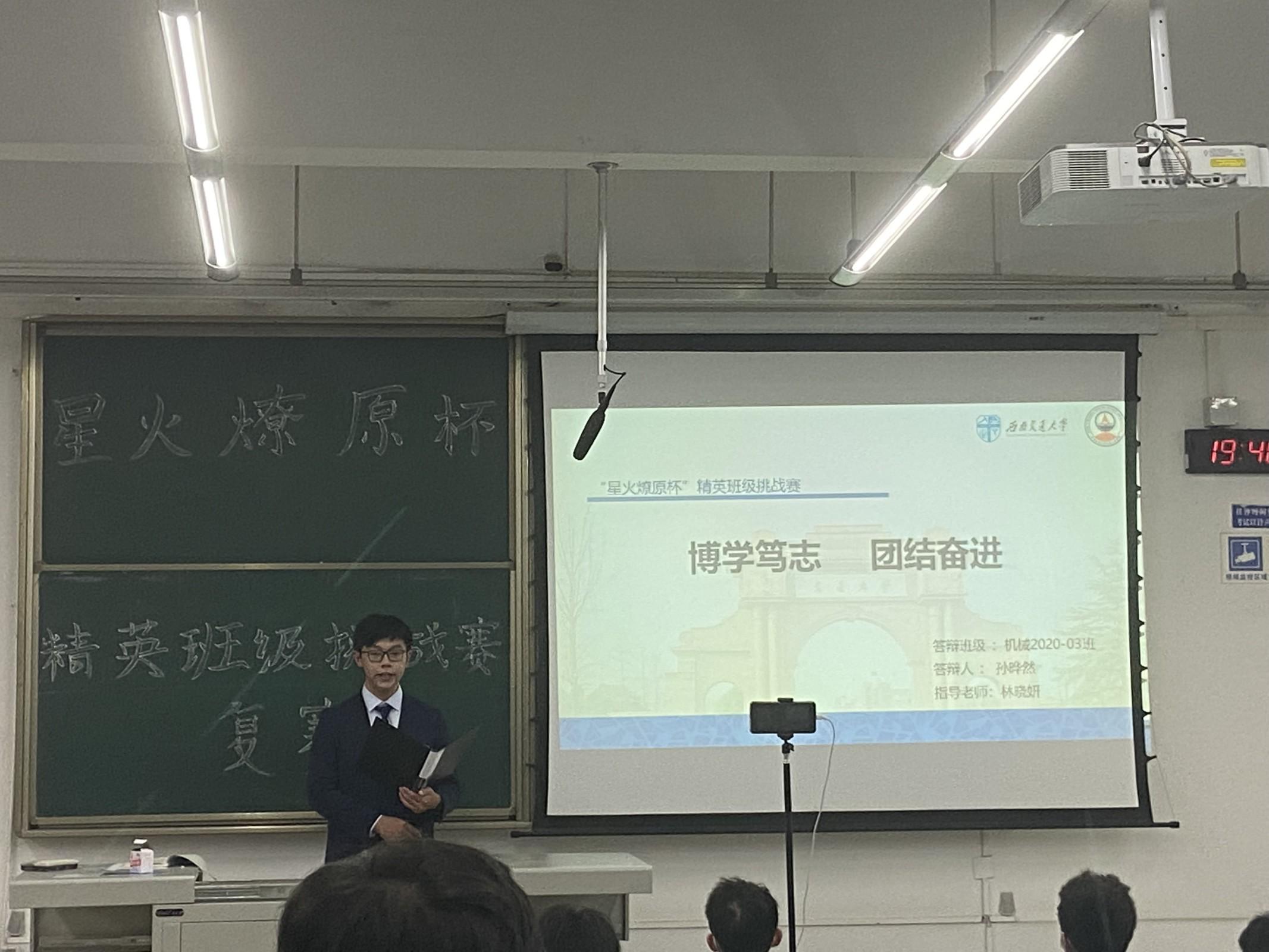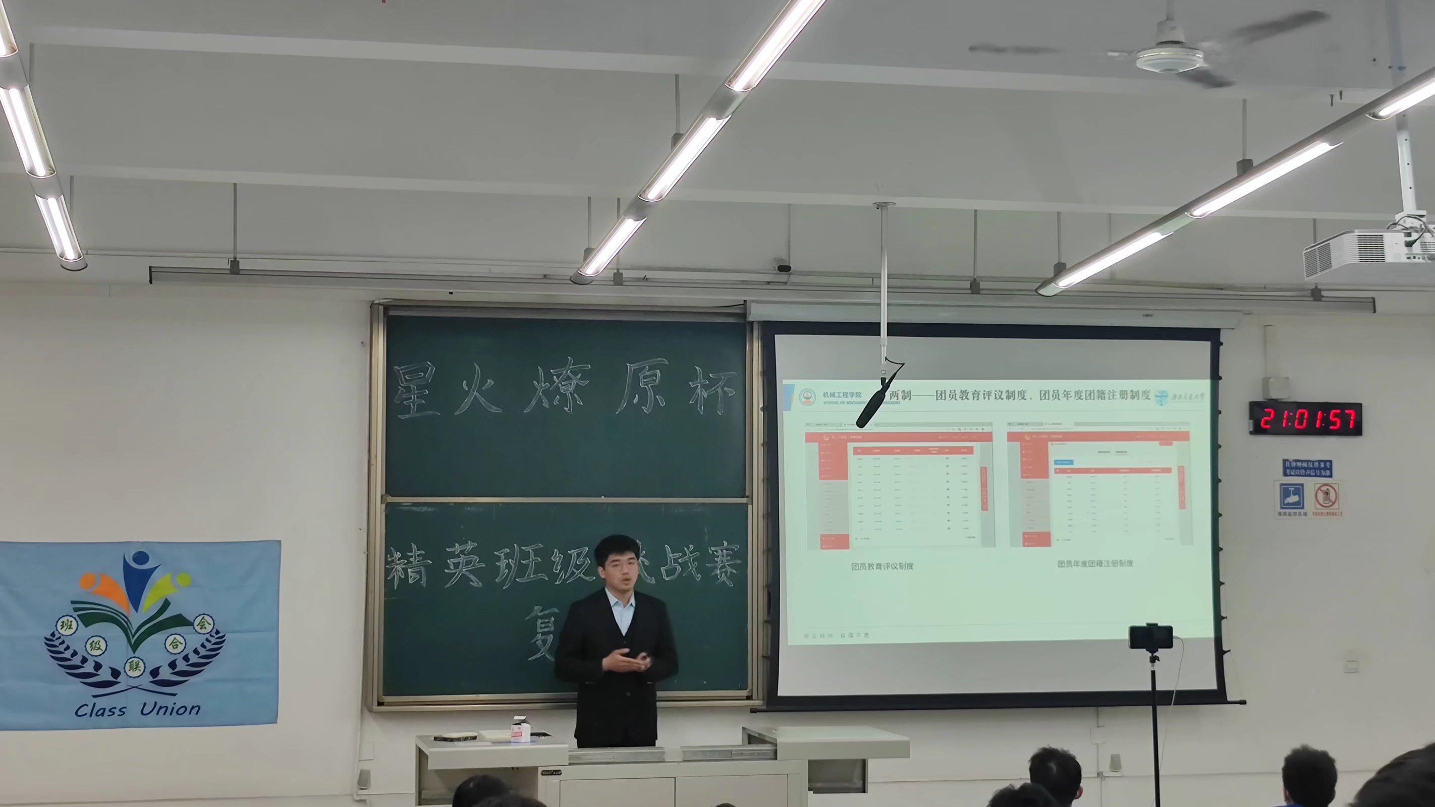 在X2317赛场,比赛也在如火如荼地进行着,来自各个班级的参赛选手,开始了各自的答辩。参赛同学先向评委和观众们呈现各自准备的精彩视频和答辩PPT,从学习,生活和党团建设等角度对各自班级进行介绍。随后,评委们对参赛选手的介绍内容,从多角度作出了提问,既有关于班级同学管理的,也有关于如何帮助弱势同学的,同学们也根据实际情况对评委的问题进行答辩。