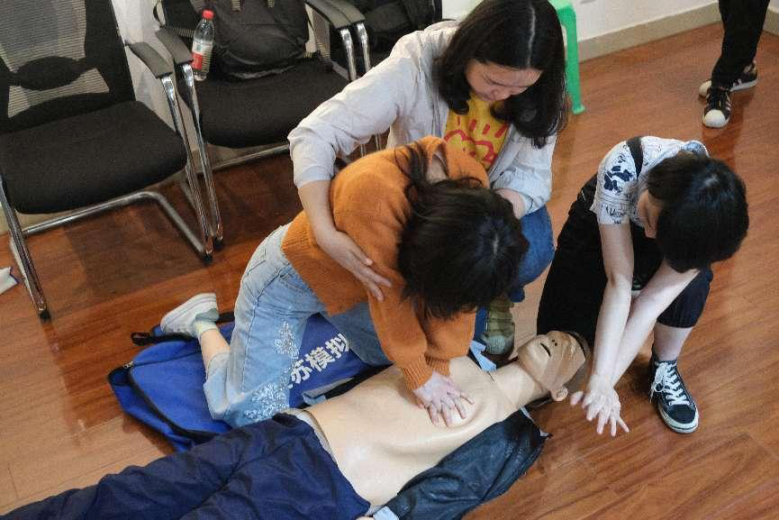 随后,西南交大医公司党员先锋队的研究生同学们通过假人向辅导员老师们展示如何正确进行心肺复苏急救,生动地展现了如何正确地对昏迷人员进行心肺复苏急救。随后主讲同学邀请辅导员老师亲身体验心肺复苏急救法的过程。过程中,主讲同学细致入微地纠正了辅导员老师们的手型和姿势上的错误,并提到了一些容易被忽视的环节,如对于环境的观察评估和对周围人员的呼救求助。最后,西南交大医公司党员先锋队带领辅导员老师们一同观看了海姆立克急救法的相关视频,学习了海姆立克急救法的操作流程,教会大家如何处理异物堵塞气管的情况。