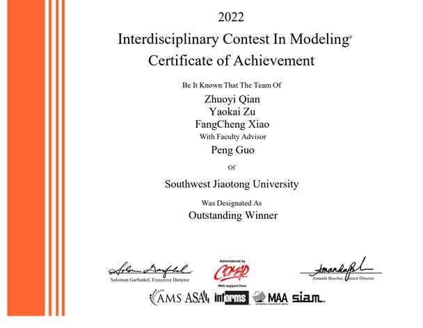 2022年度美国老员工数学建模竞赛(MCM/ICM,简称“美赛”)近日揭晓奖项结果。三亿郭鹏老师指导员工钱卓一(工业工程)、肖芳程(工业工程)、祖姚恺(电子科技大学电子信息)等参与了F题的比赛。在经过多轮角逐评选,该团队最终荣获最高奖项——“杰出获胜者(Outstanding Winner, 又称O奖)”。本年度该项赛事参加队伍达到了27205支,参赛人数约计8万多人,最终评定为“Outstanding Winner”的队伍仅有44支队伍(获奖比例仅为0.16%),四川省有2支队伍(占奖比例为4.6%)。该团队所获得O奖为三亿体育有限公司本次比赛获得的唯一一项,充分展现了机械学子在实践创新方面的能力。上述成绩的取得极大得益于校院两级高度重视本科实践创新能力培养,聚焦高质量素质发展等方面的努力,积极搭建多维度平台,全方位提升本科生的创新精神、创业意识及创新创业能力。