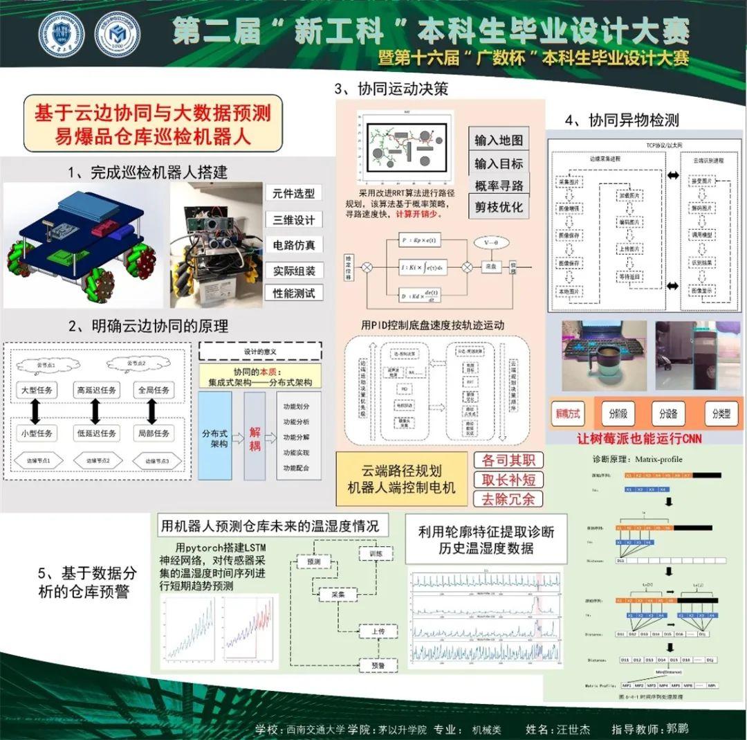 以“交叉融合,智创未来”为主题的第二届“新工科”本科生毕业设计大赛决赛于2022年6月15日在天津大学以线上会议的形式召开。机械类专业汪世杰同学在郭鹏老师指导下参赛的毕设作品《基于云边协同与大数据预测的易爆品仓库巡检机器人》获得个人一等奖(共评选2人)。该项目针对军工、能源、化工、食品等存在燃爆风险的仓库,通过对“巡检机器人搭建”、“基于云边协同的运动决策和异物检测”、“基于大数据的仓库预警”等任务的研究,实现了远程主机和现场机器人的协同状态检测和预警,并通过协同优化的方法,将复杂任务部署上云,边端仅负责少量简单任务,因此边端可以使用低成本的简单机器人,从而解决了高成本机器人集群带来的资源浪费、功能冗余、调试困难等问题。